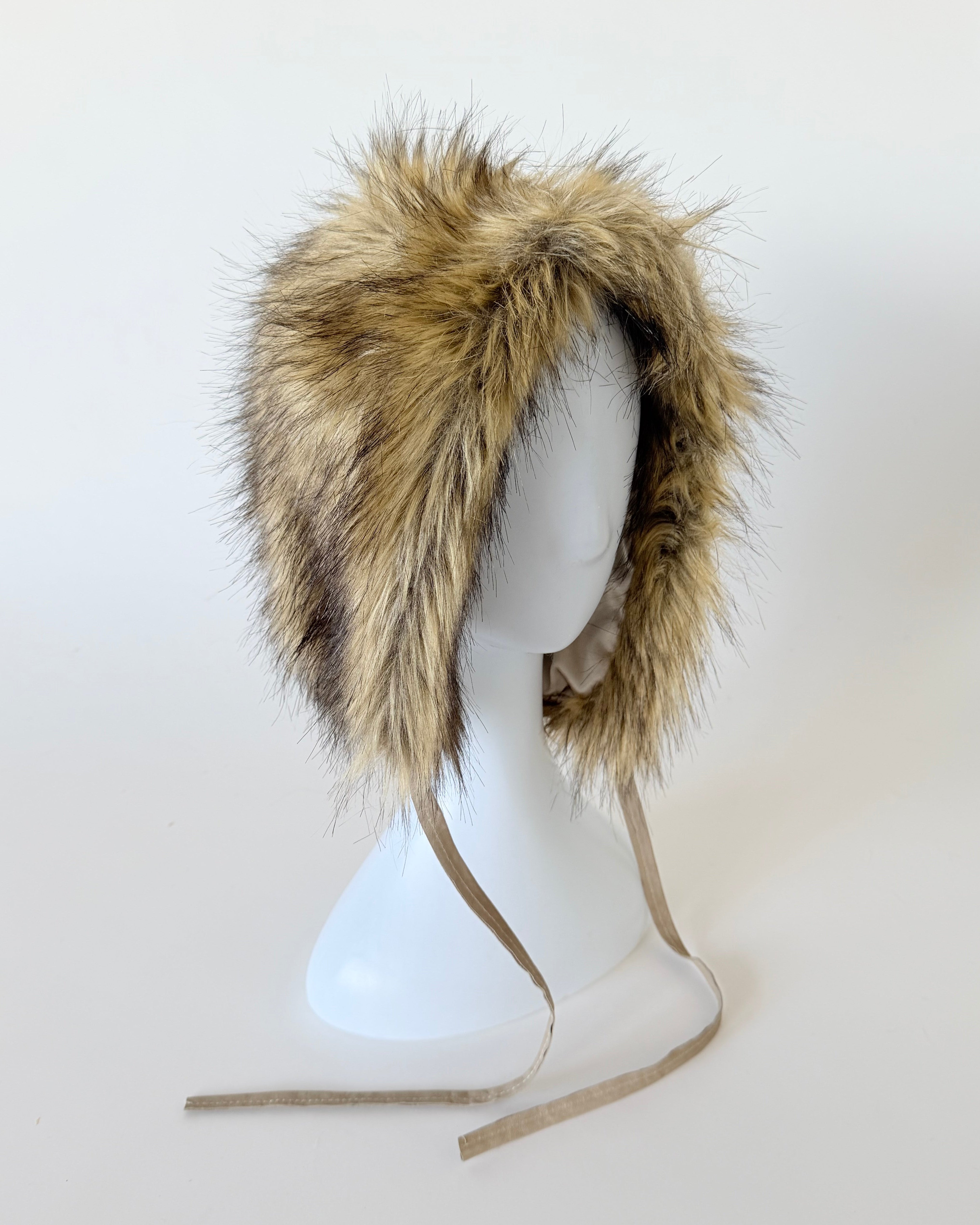Faux fur bonnet with lambskin ties, satin lined. Soft hand.