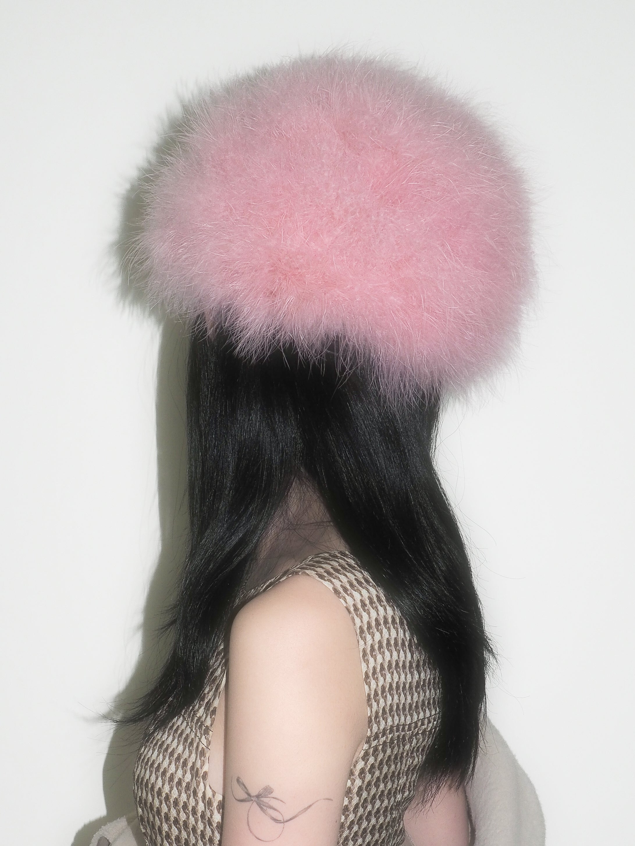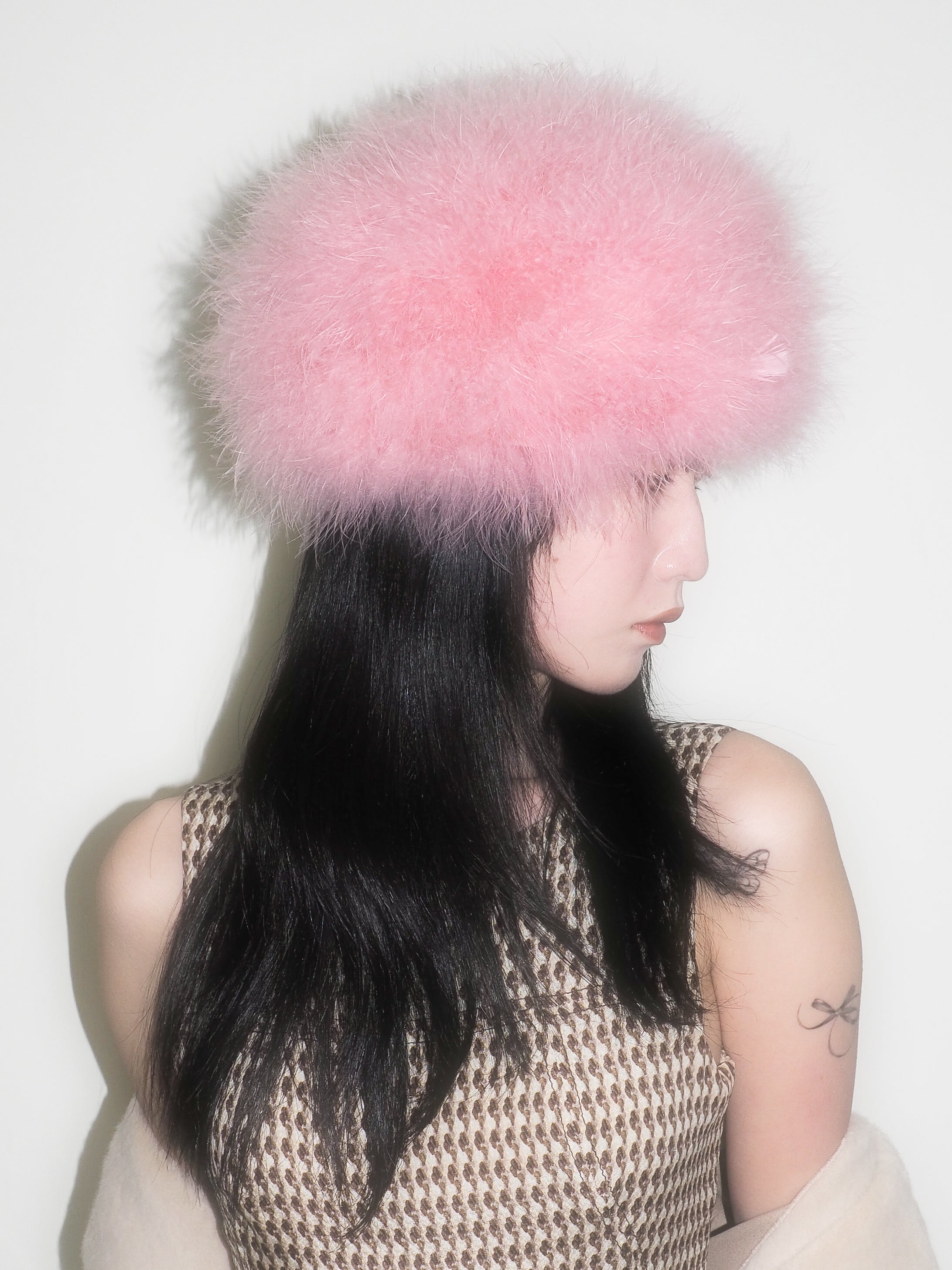 Blocked pillbox hat featuring feather outer for a cloud like feel.