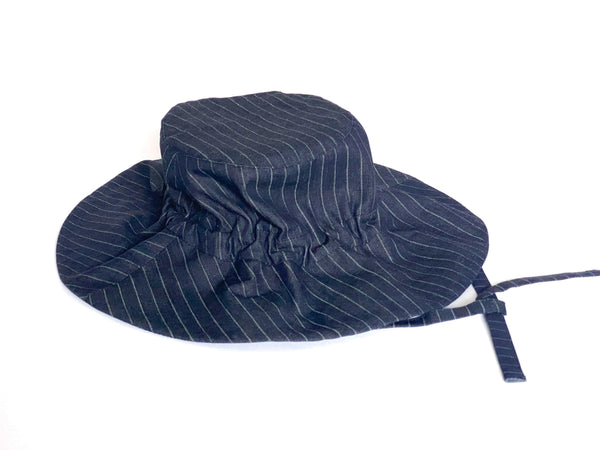 Cinchable lightweight cotton bucket hat. Tie-able drawcords. Headband cinches using neckties. Head size is adjustable. Unisex